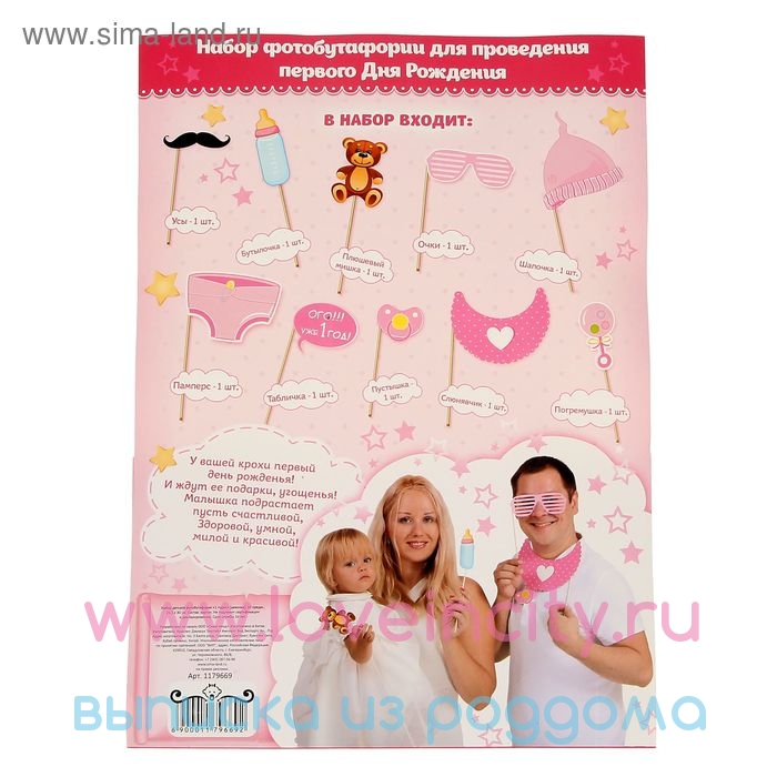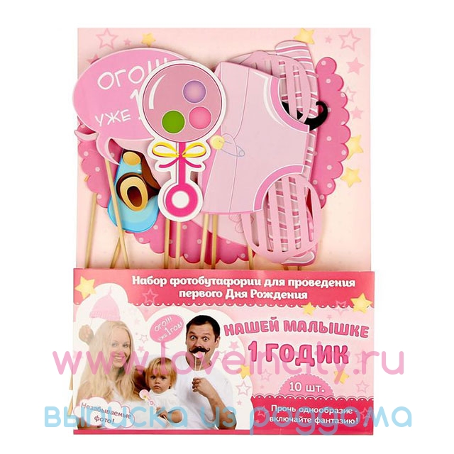 Милый комплект бутафории для фотосъемки "Малышке 1 год!" украсит фотосессию с ребенком! В набор входят 11 яркие таблички для фотосессии в виде игрушек, детских вещей, усов, а также таблички с надписью "Ого! Уже 1 год!", "В ожидании чуда" и т.д. Таблички закреплены на деревянных палочках. Набор оформлен в розовых тонах. Такие таблички украсят фотосессию на детском празднике!