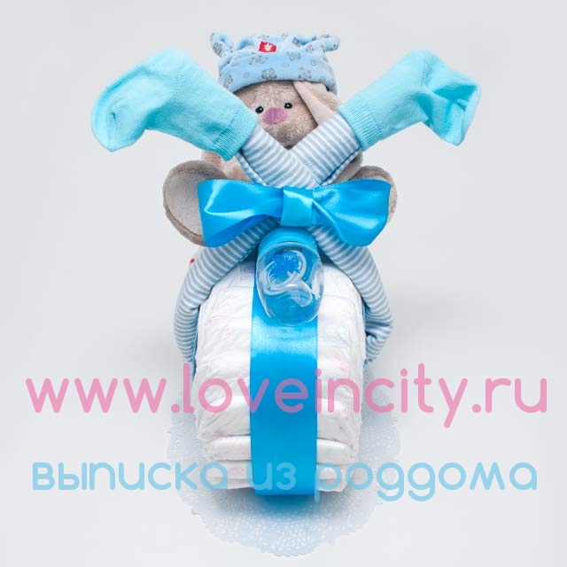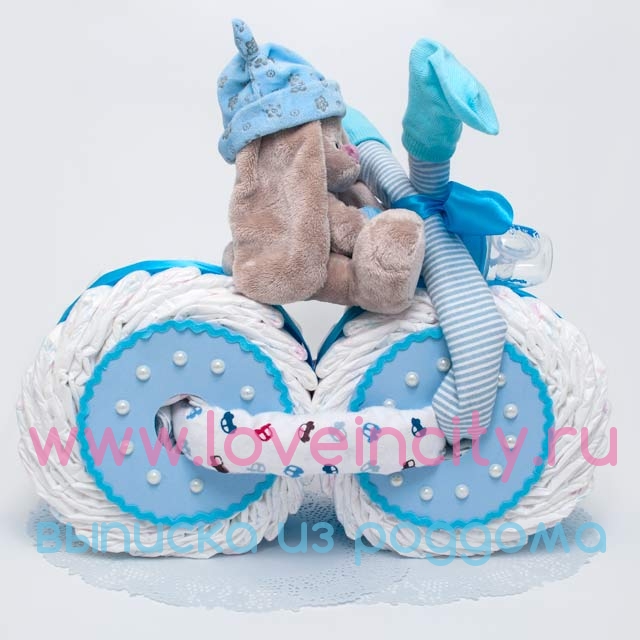 Мотоцикл из подгузников "Зайка Ми" - это весьма оригинальный и полезный подарок на выписку из роддома или на день рождения ребенка. Этот мотоцикл составлен из 2 пленок (фланель), бутылочки, носочков и игрушки "Зайка Ми". Основа мотоцикла - японские памперсы марки "Merries" - 40 шт. Мотоцикл украшен большой атласной лентой голубого цвета, а диски выполнены из дизайнерской бумаги и декорированы ленточкой и бусинами.